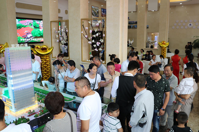 天河广场营销中心位于政通路与嵇康路交口东北角,售楼部大气明亮,极富现代感。当天,现场人头攒动,前来咨询的客户将咨询台围得水泄不通,人气爆棚。据统计当天共接受咨询近千起,潜在业主近四百余名。