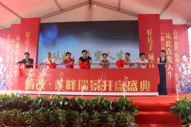 2016年9月25日,青阳的清晨阳光和煦,微风伴着桂香,轻柔拂面。城改莲峰瑞景项目营销中心大门外广场,彩旗飘展,红毯炫目,热烈而奔放,一派喜气洋洋。