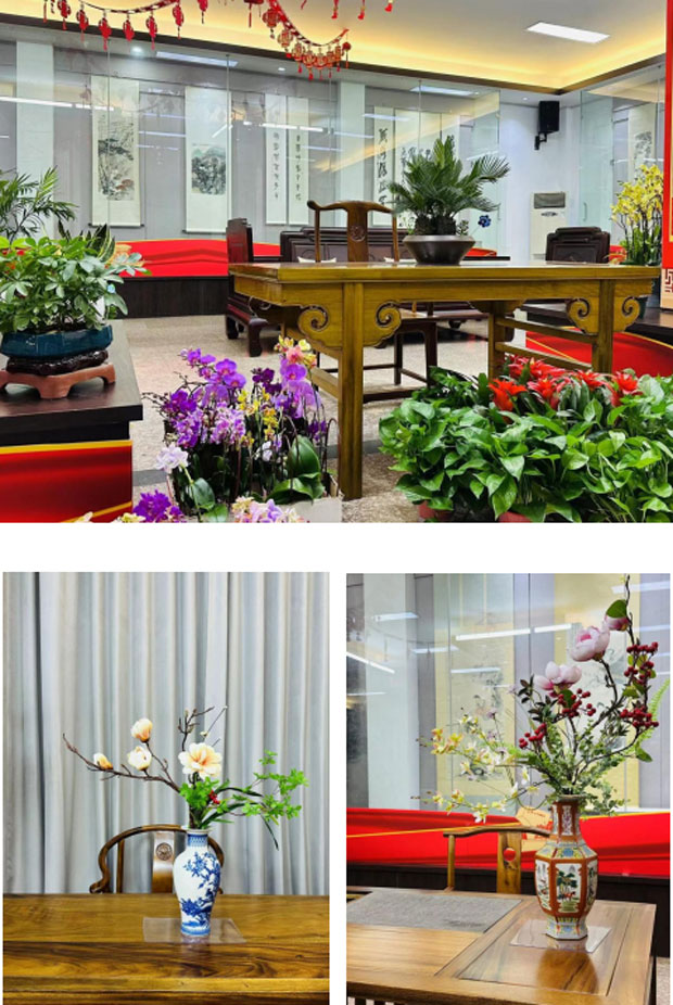 在“裕丰展览中心”,集中展示传统书画作品 200 余幅,中国传统插花作品 20 余件,传统红木家具作品10余套,裕丰首次将传统插花、传统书画作品与传统红木家具相融合,力求做到花卉构造、国风意蕴与工艺美学相融相生,美轮美奂,掀起了一阵新经典美学风潮,同时也增加了“淡泊以明志,逍遥以随心”的清雅,形成移步异景观展效果,让人流连忘返。