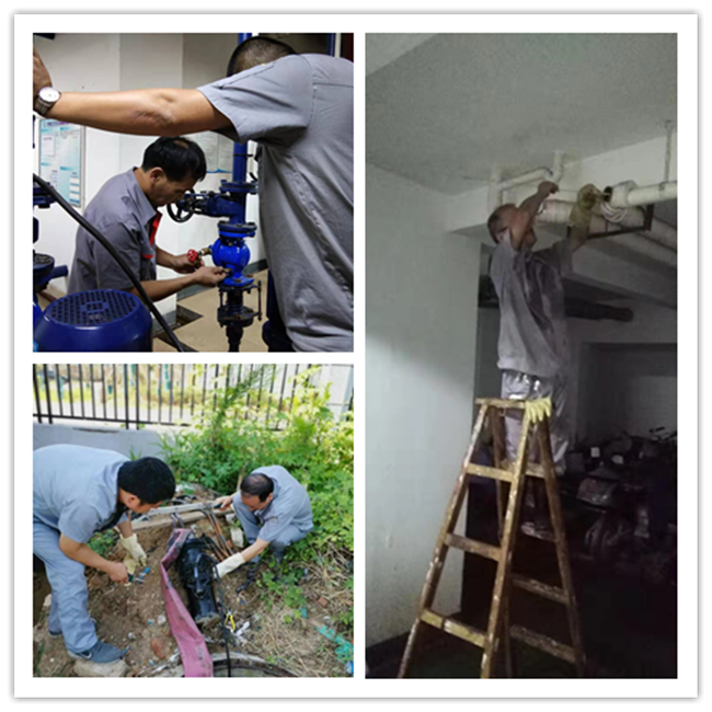 在小区配电房、水泵房、地下室等地方,维修师傅们需要不间断检查各项设施设备,包括是否存在安全隐患,用电线路是否正常等。不仅如此,他们每天还要巡查室外公共设备情况,及时修复受损设备,尽管在酷热的天气里,维保工作仍要继续。