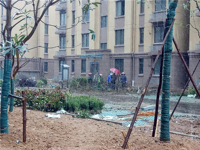 11月25日,在夹杂着雨和雪的日子里,绿泉公司施工人员仍坚持一线,对霍山天池瑞景小区二期绿化工程紧张施工。风雨寒冷何所惧,大干抢工进行时。为确保天池瑞景二期绿化工程能如期竣工,实现按期交房,绿泉公司现场施工人员带着工人在雨雪中奋战不停抢工期。雨雪阻挡不了施工人员抢抓工期的拼搏精神,阻挡不了战胜寒冷雨雪考验的热情干劲!