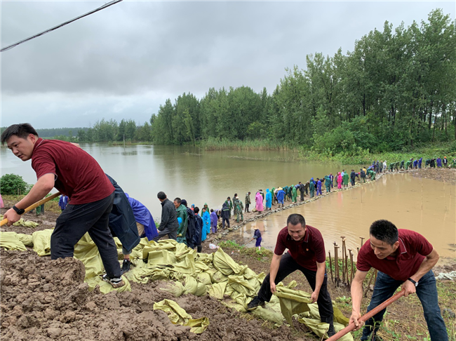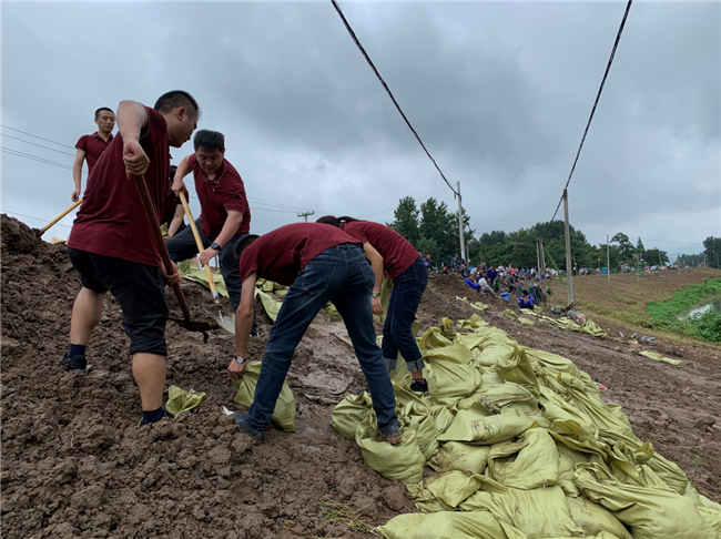 7月16日上午8:30,赈灾小组在恶劣的天气下准时出发,飞奔了两个多小时,到达了芜湖市鸠江区白茆镇。大雨不停,情况紧急,救援刻不容缓。在和白茆镇党委对接后,未停一刻,大家立即赶往抢险第一现场——南垄外圩,在这里,顺昌物业人同村民一起,装设沙袋、加固大堤,以防止江水漫延,整整一天未曾休息。流不尽的汗水和不曾停歇的脚步,只为让防线更加牢固,保护美丽的家园。