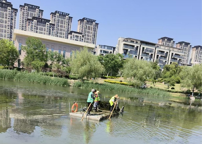 在阜合产业园区翡翠湖公园,养护部员工岳学华带领保洁人员打捞湖面水草、清理漂浮物,开展安全巡检和文明劝导工作,全力以赴保障五一期间产业园区河道景观水清岸洁、文明有序。