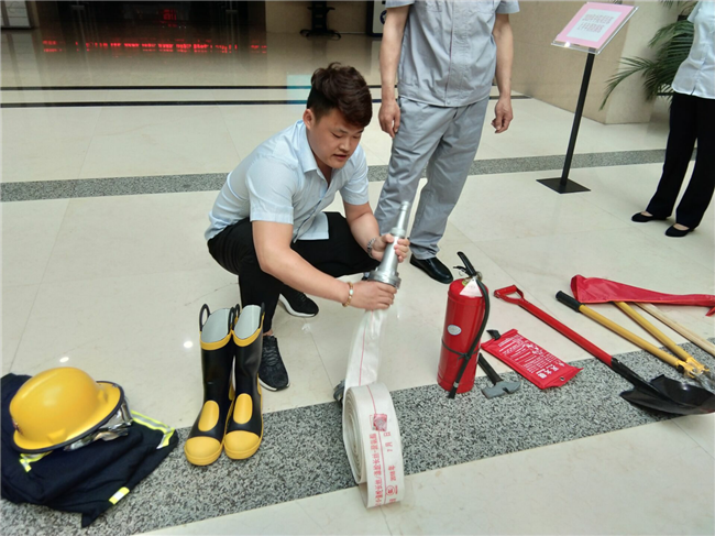 首先,项目部维修主管丁友胜针对如何预防火灾事故、正确拨打火警电话、组织人员疏散逃生、使用消火栓和灭火器、扑救初起火灾等内容进行了详细讲解,介绍了防火、灭火的技巧和方法,讲述了灭火设施、器材的使用方法及操作要点。随后,项目部管理员张震带领大家进行实操演练,此次实战演练方式开展,演习假设二楼某房间起火,浓烟导致烟感报警器启动报警,消防控制室值班人员接到报警后第一时间启动灭火应急疏散预案,拨打“119”向消防指挥中心报警求援,同时疏散组迅速到位对楼层内人员进行疏散撤离,单位员工按照日常所学的消防知识,弯腰捂鼻、有序疏散。本次消防演练准备充足,各岗位按照应急预案紧密配合,严格按照应急方案执行,面对火灾,反应处理迅速得当,井然有序。